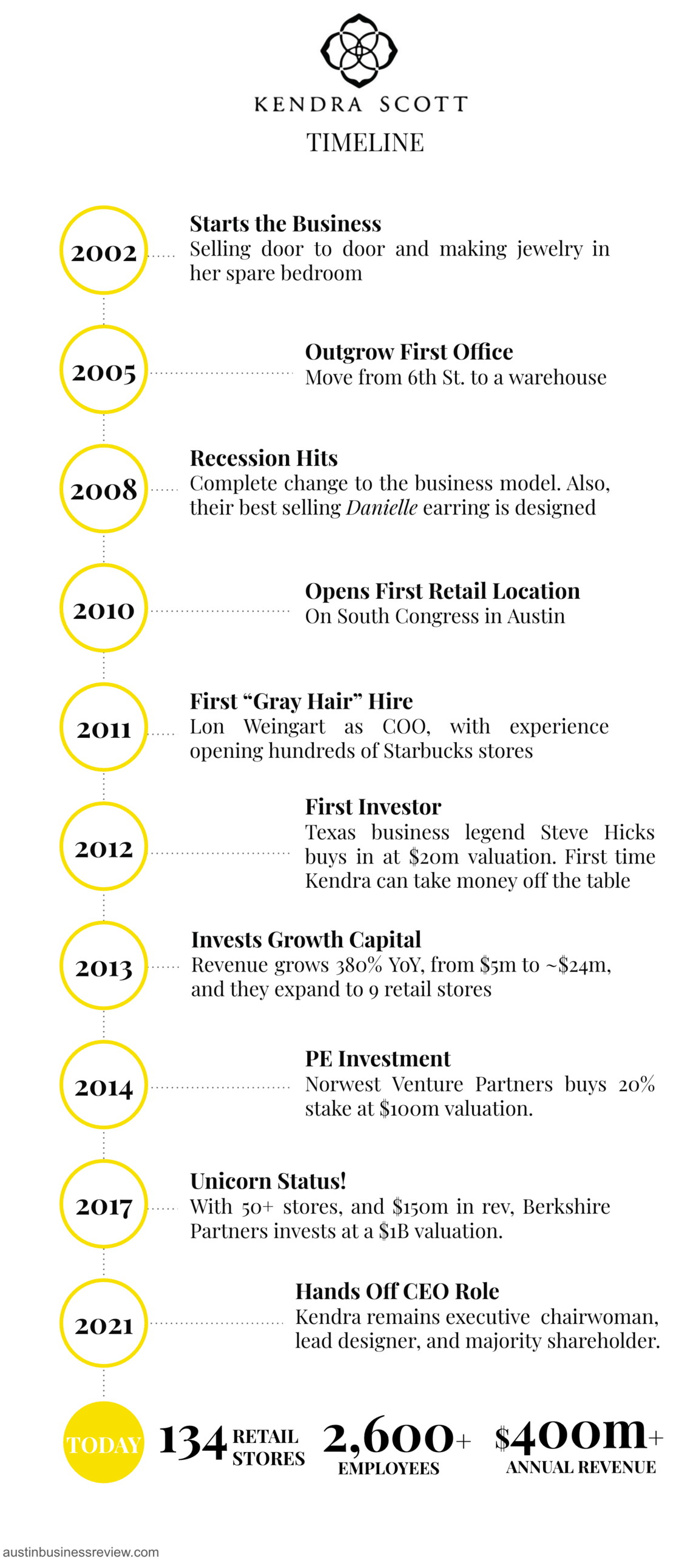 Early to Influencers: Her first part-time hire was a middle-aged woman who had a fashion-focused newsletter at the time. Hiring the “Hat Lady of Austin” helped grow foot traffic to the shop, and that lesson – that you must give people a reason to come in – remains key to Kendra Scott’s retail strategy today.
