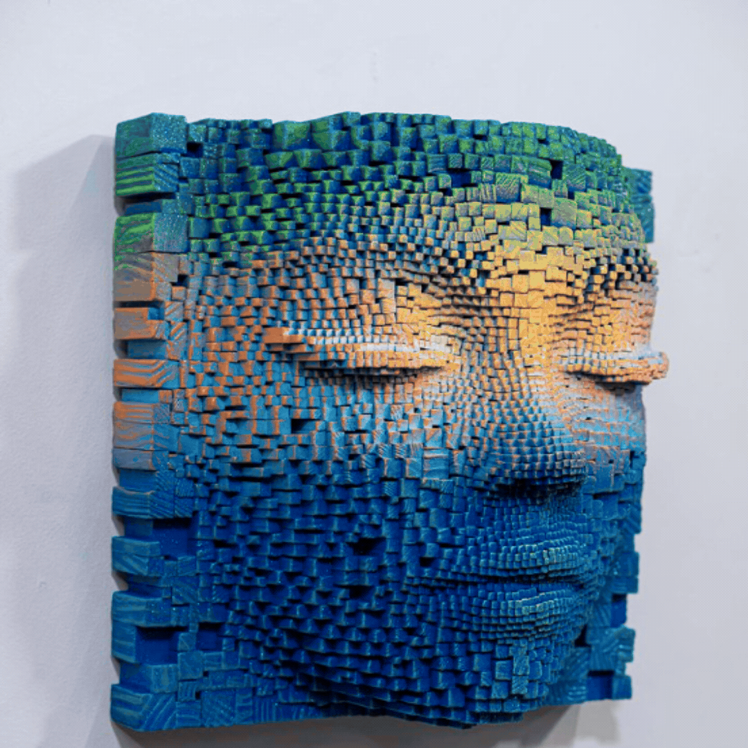 He caught my eye with his “Masks” series, which is made from hundreds of intricately charred, stacked, and painted wood block “pixels” arranged to look like human faces.