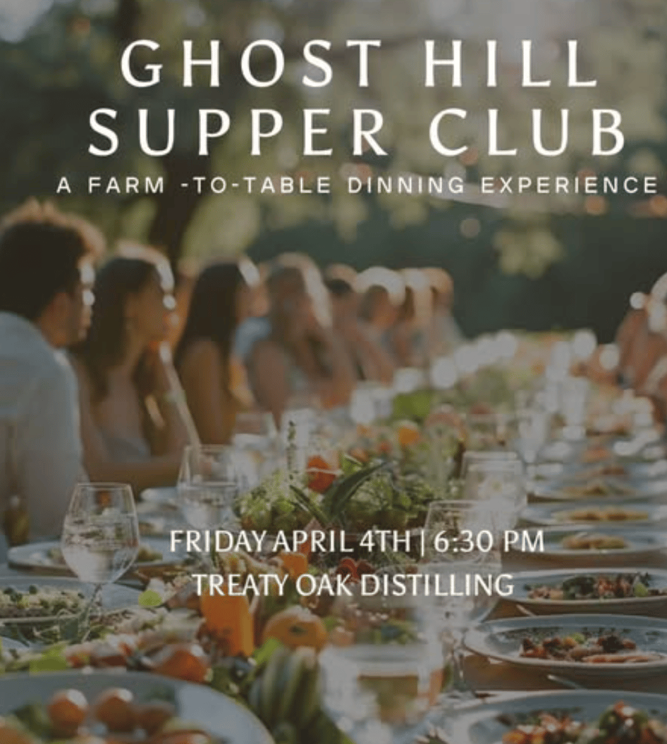 One Last Thing… On April 4th, Treaty Oaks Distillery is co-hosting for a 5-course spring-themed candle lit dinner beneath the trees with Ghost Hill Supper Club. Tickets are: