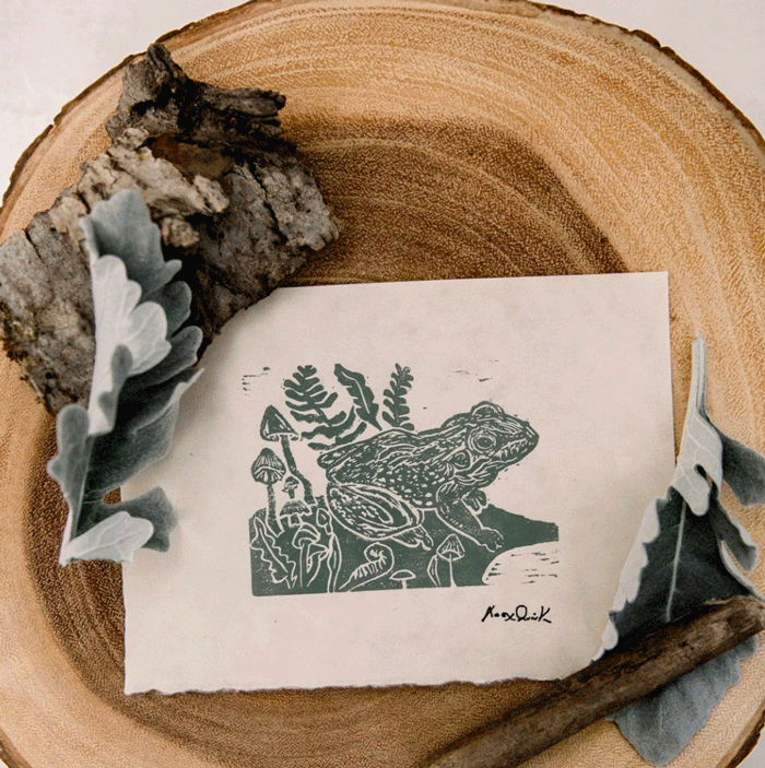 So that’s how Alex Quirk became this issue’s Artist of the Week. She does these cool nature-inspired woodcut prints, and tiny landscapes (about the size of a box of matches). She also takes commissions for watercolor pet portraits which are just 🤌