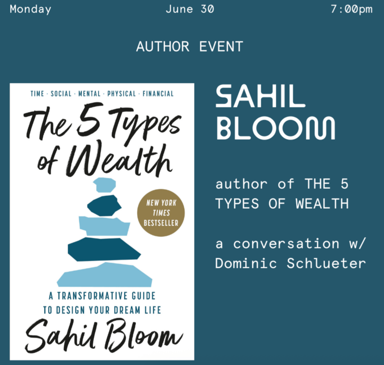 One More Thing… Speaking of books, Sahil Bloom is coming to town June 30, to talk about his NYT best seller, The 5 Types of Wealth. It’s very good.